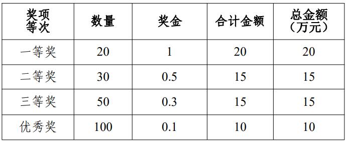 3.創意賽道:入圍決賽團隊最多 200 支,設一等獎 20 個,獎金10000 元/支團隊;設二等獎 30 個,獎金 5000 元/支團隊;設三等獎50 個,獎金 3000 元/支團隊;設優秀獎 100 個,獎金 1000 元/支團隊。上述獎金為稅前金額。