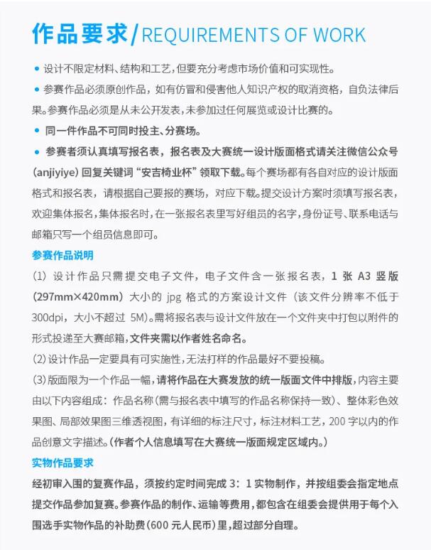 參賽者須認真填寫報名表,報名表及大賽統(tǒng)一設(shè)計版面格式請關(guān)注微信公眾號(anjiyiye)回復(fù)關(guān)鍵詞“安吉椅業(yè)杯”領(lǐng)取下載。