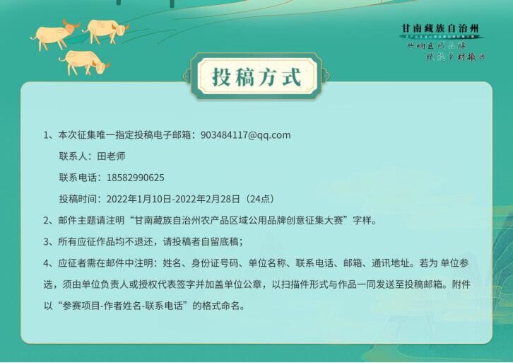 2.郵件主題請(qǐng)注明“甘南藏族自治州農(nóng)產(chǎn)品區(qū)域公用品牌創(chuàng)意征集大賽”字樣。應(yīng)征者需在郵件中注明:姓名、身份證號(hào)碼、單位名稱、聯(lián)系電話、郵箱、通訊地址。若為單位參選,須由單位負(fù)責(zé)人或授權(quán)代表簽字并加蓋單位公章,以掃描件形式與作品一同發(fā)送至投稿郵箱。附件以“參賽項(xiàng)目-作者姓名-聯(lián)系電話”的格式命名。